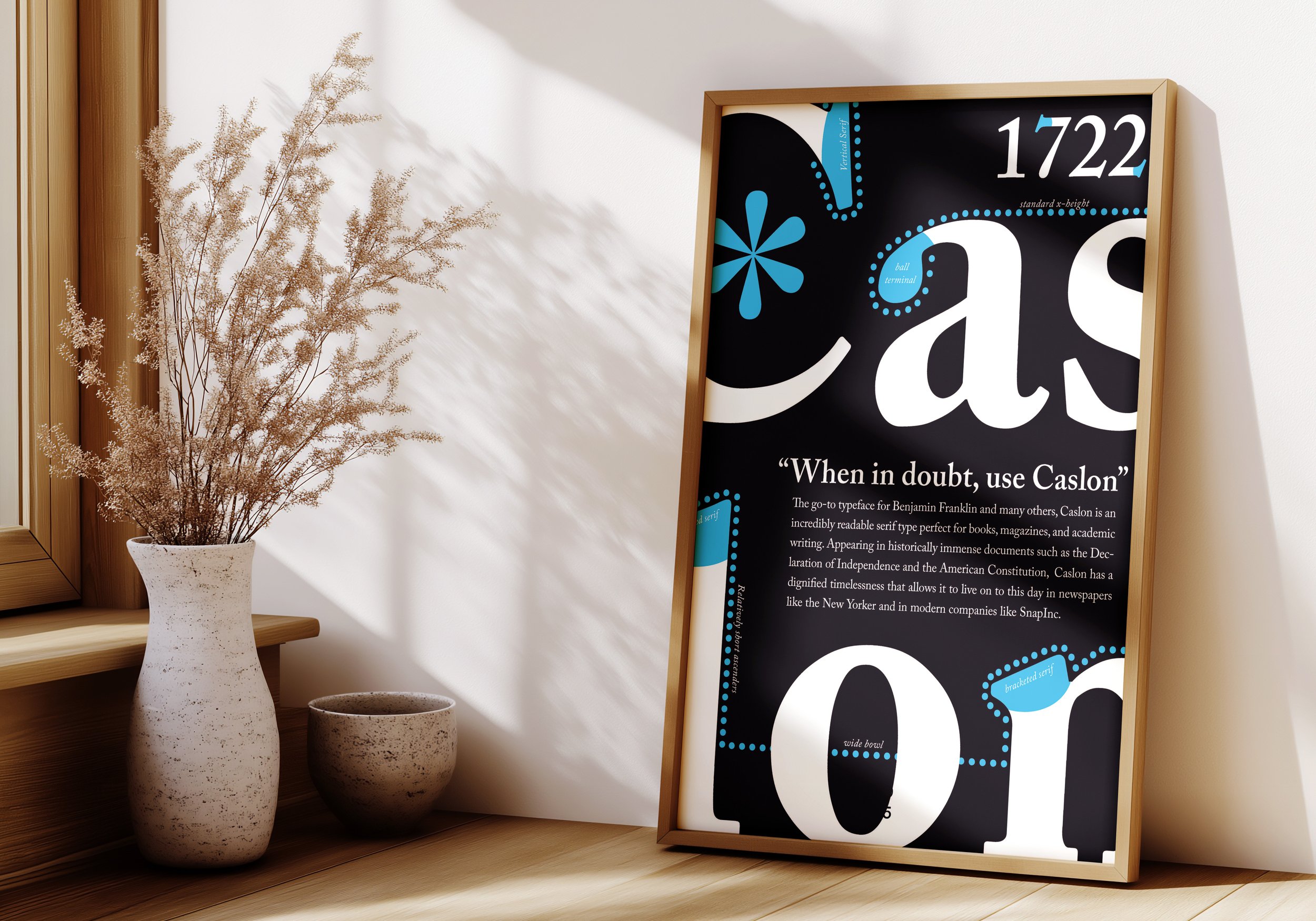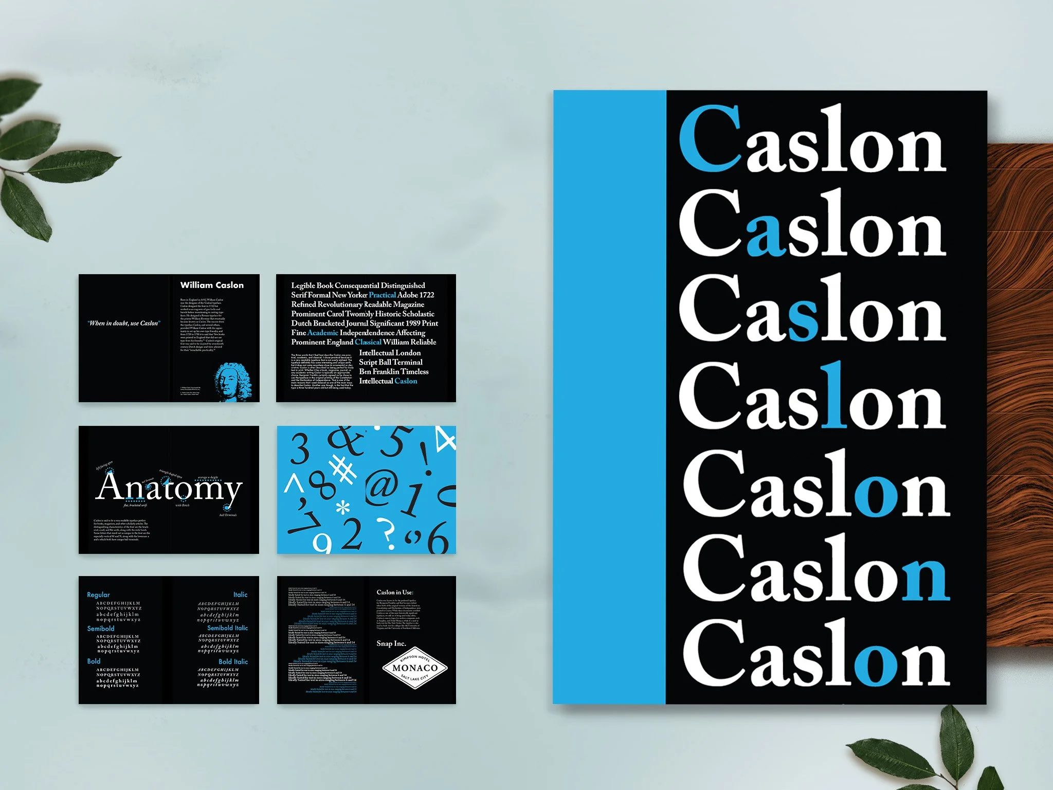 A second aspect of the project with a 5.5” x 8.5” book outlining the defining characteristics of Caslon as a typeface.